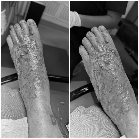 The first image shows the wound in its most critical state: deep, infected, and non-healing, with visible signs of devitalized tissue (necrosis). This is the kind of wound that often leads to a recommendation for limb amputation elsewhere.